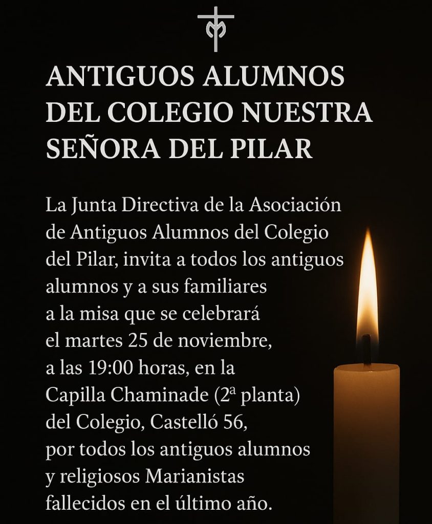 La Junta Directiva de la Asociación de Antiguos Alumnos del Colegio del Pilar, invita a todos los antiguos alumnos y a sus familiares a la misa que se celebrará el martes 26 de noviembre, a las diecinueve horas (7 de la tarde), en la Capilla Chaminade (2ª planta) del Colegio, Castelló 56, por todos los antiguos alumnos y religiosos Marianistas fallecidos en el último año.